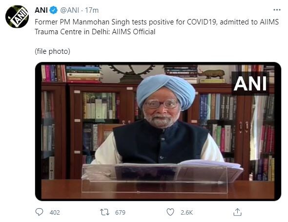 ਸਾਬਕਾ ਪ੍ਰਧਾਨ ਮੰਤਰੀ ਮਨਮੋਹਨ ਸਿੰਘ ਨੂੰ ਵੀ ਸੋਮਵਾਰ ਨੂੰ ਕੋਰੋਨਾ ਵਾਇਰਸ ਦੀ ਲਾਗ ਦੀ ਪੁਸ਼ਟੀ ਹੋਈ ਹੈ। ਉਨ੍ਹਾਂ ਨੂੰ ਇਲਾਜ ਲਈ ਆਲ ਇੰਡੀਆ ਇੰਸਟੀਚਿਊਟ ਆਫ ਮੈਡੀਕਲ ਸਾਇੰਸਜ਼ (ਏਮਜ਼), ਦੇ ਟ੍ਰੌਮਾ ਸੈਂਟਰ ਵਿੱਚ ਦਾਖਲ ਕਰਵਾਇਆ ਗਿਆ ਹੈ।
